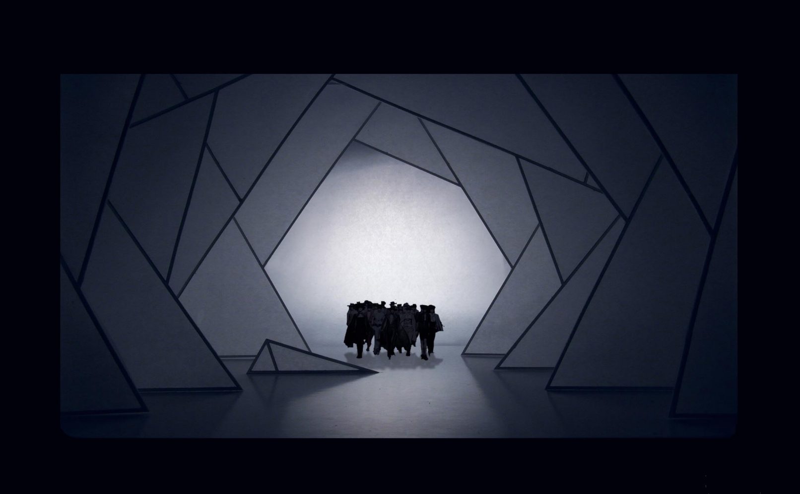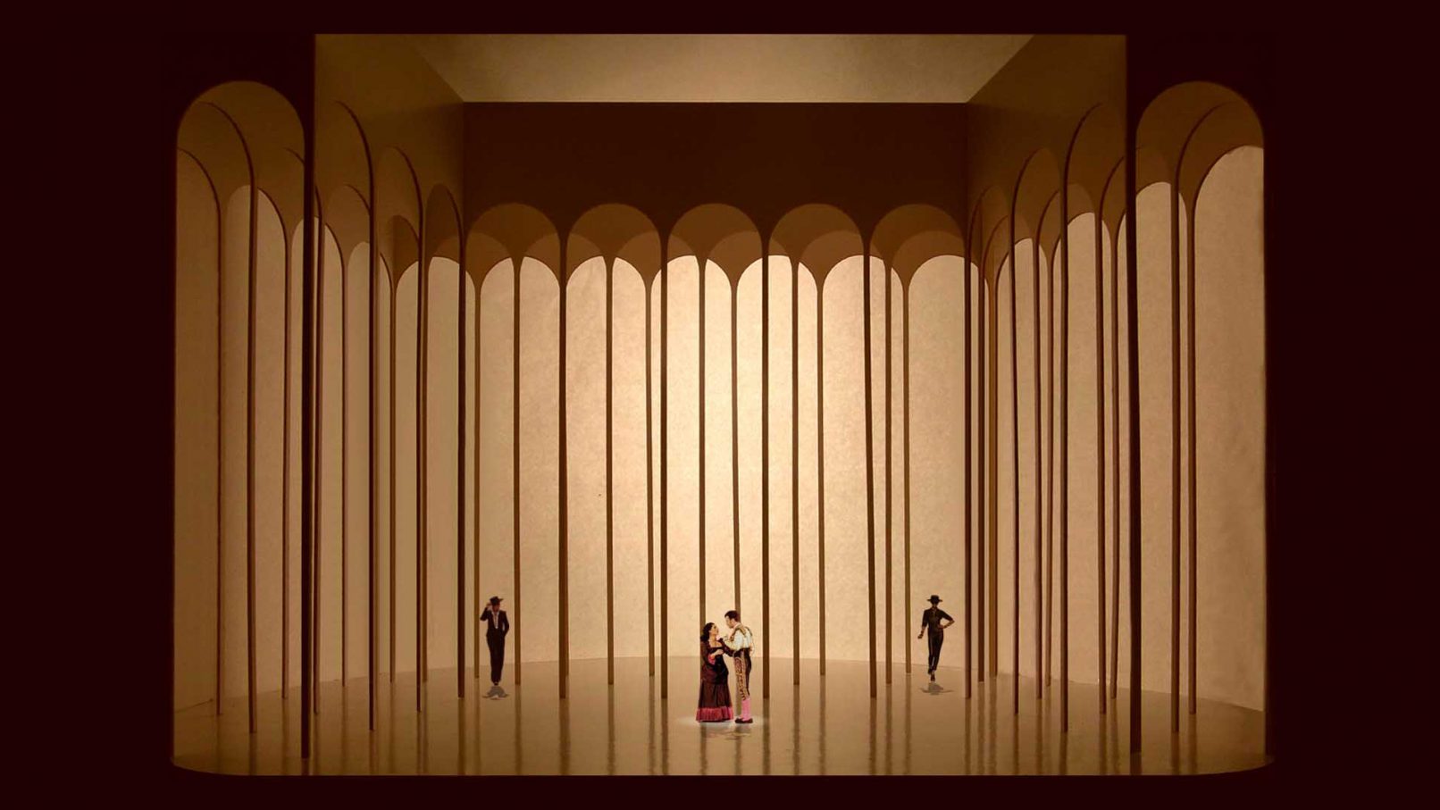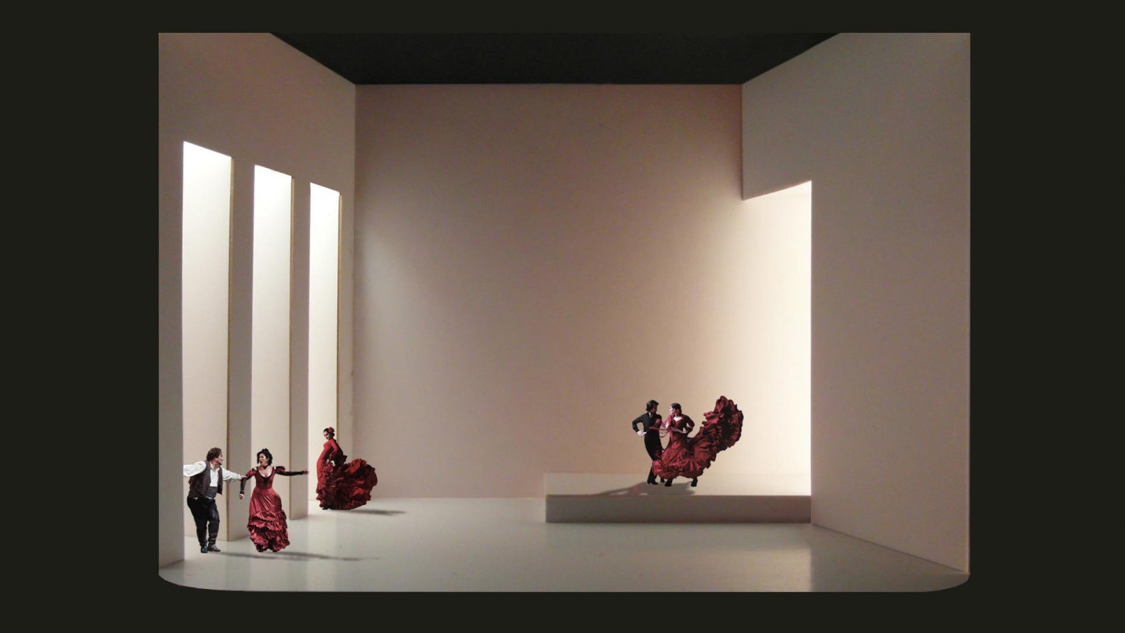 This scenery aims to be a contemporary review of the classical opera stage design. Avoiding reproductions, light and shadows are used to recreate the atmosphere described by the author, and locations are referred by abstract elements to allow the audience its own interpretation. Besides decoration and materials are minimized looking for economy, using only fabric and wood for its construction. Laser cut and hand made models were used to reproduce the resulting space and lighting in the design process.