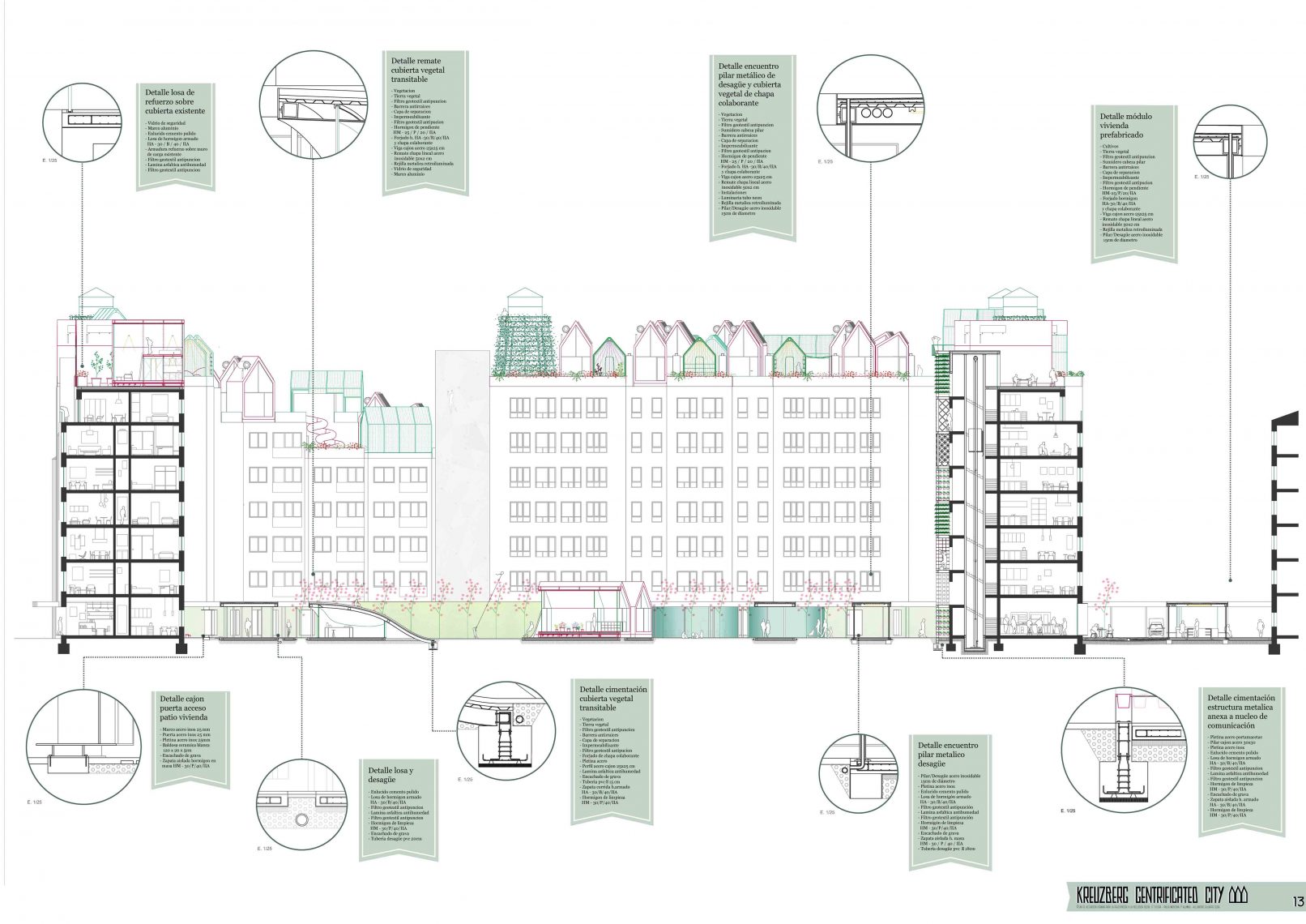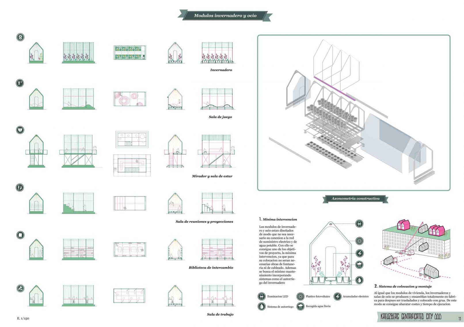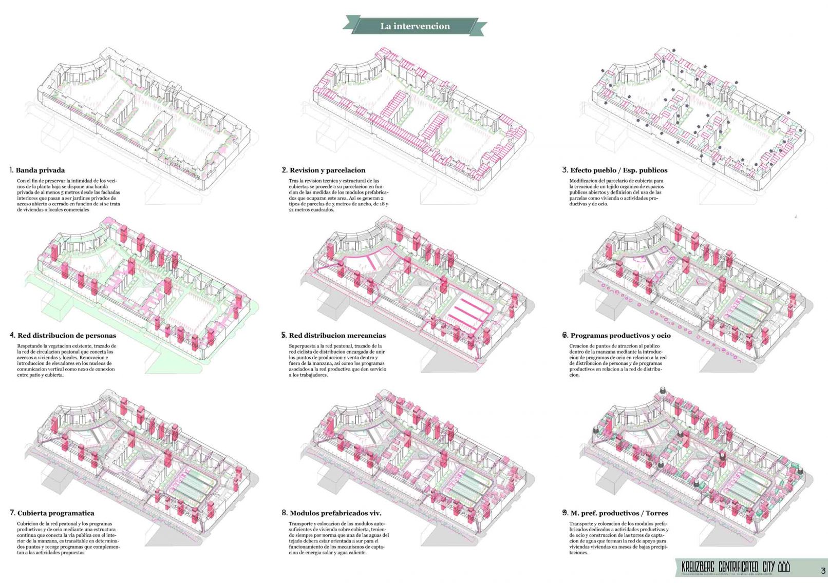 This research project proposes an urban regeneration plan to redensify and incorporate community programs in order to palliate the problems caused by gentrification. It will create a net of productive blocks to give a new income to owners and inhabitants, spreading the activity around the neighborhoods and balancing the rent prize between different areas. The new system consists of a number of prefabricated living modules and industrialized construction items which occupy the empty spaces of the existing buildings. Thereby impact, deadlines, and cost are reduced, and viability and sustainability are maximized in this urban operation.
