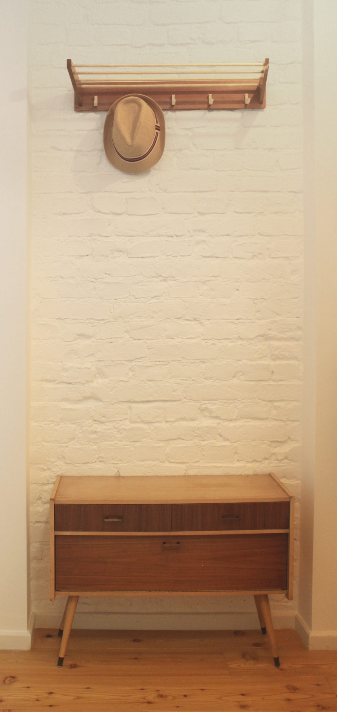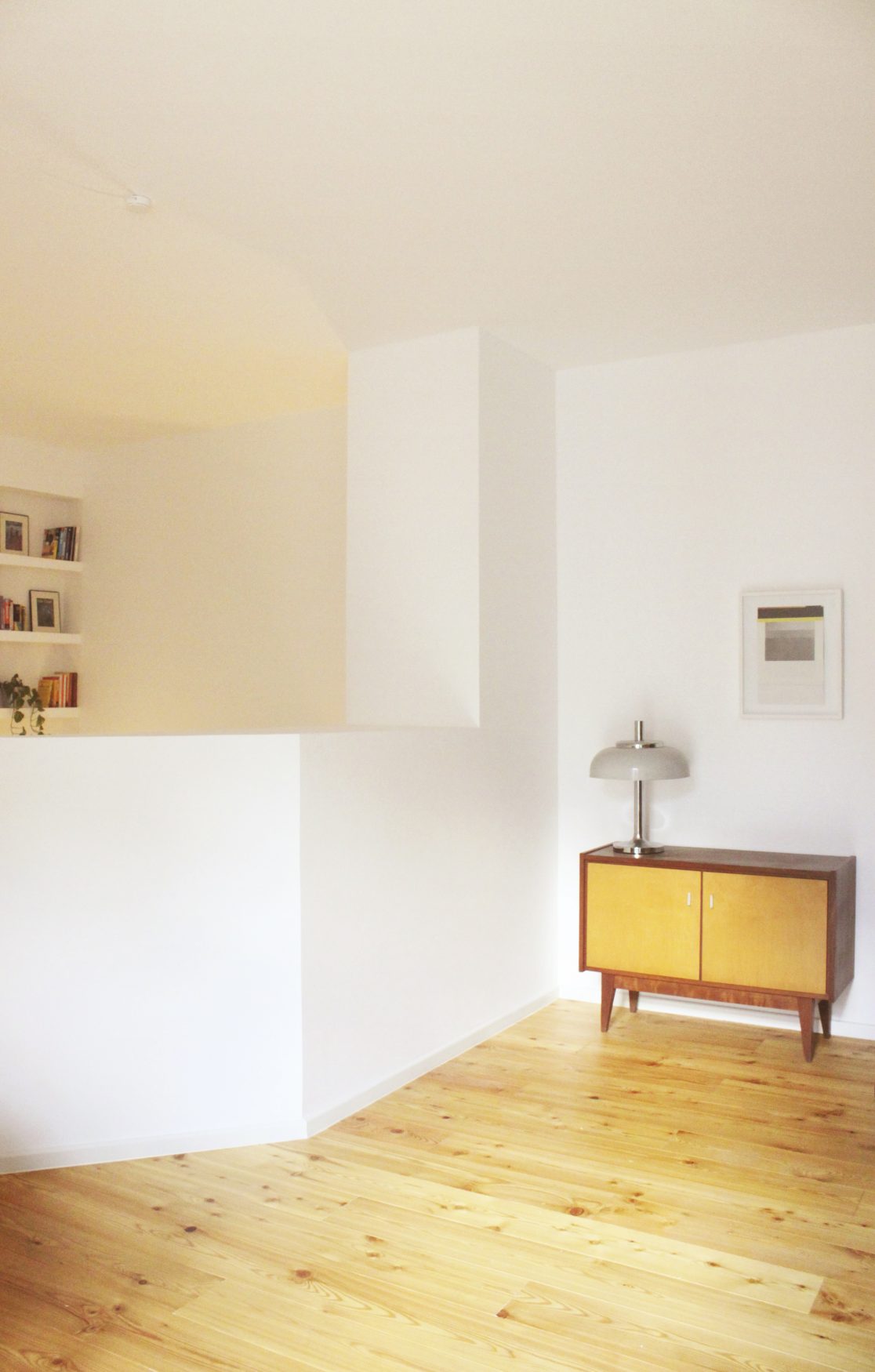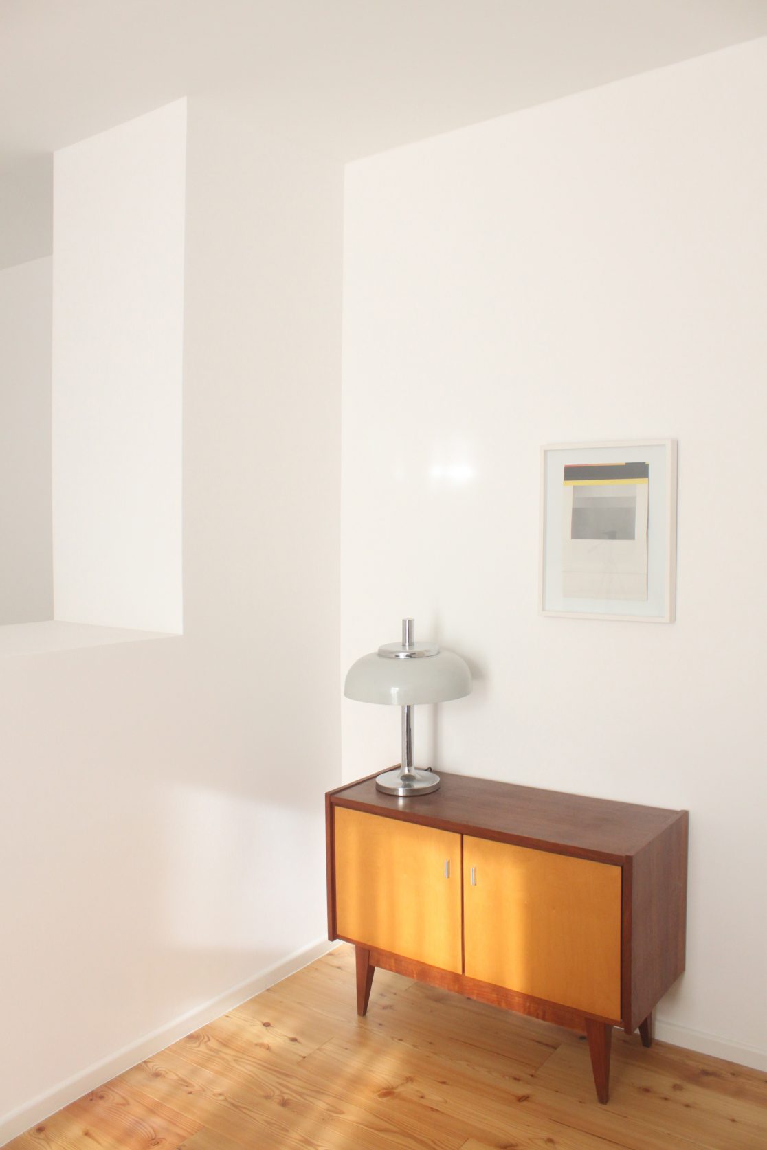 For the upgrade, we looked for a calm and clean atmosphere able to match with the Nordic retro furniture pieces from our client. Natural wood and white are the main characters, and we looked to take the most from old details of the apartment like the hidden brick walls. For the bathroom we opted for a continuous pool tile surface, giving it the spa feeling but always being inside the limited budget from our client.