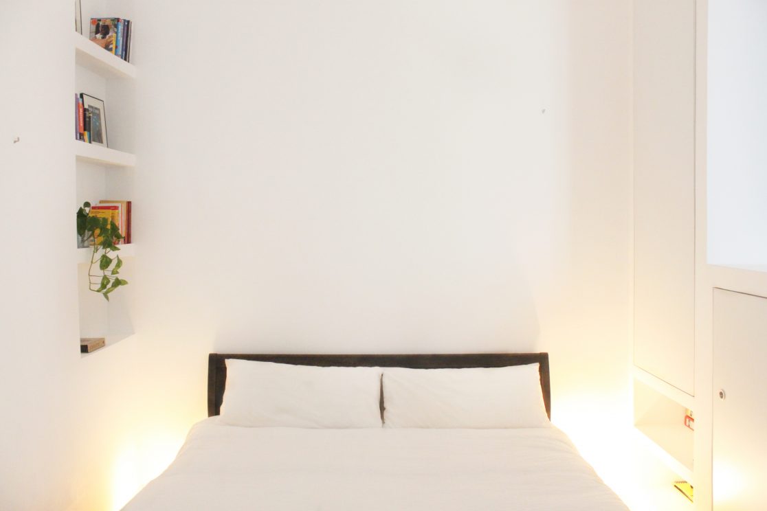 The solution was to create a sculptural volume for storage and wardrobe, that would split the studio space in living and bedroom. Due to its proportions, the sculpture allows a continuous visual perception of the space, maximizing its proportions, and clearly separating the two functions needed for the room.