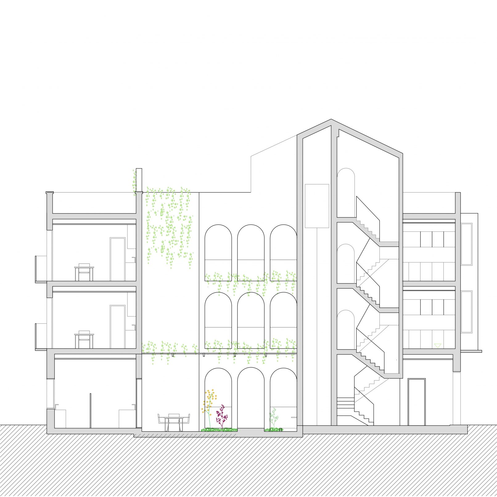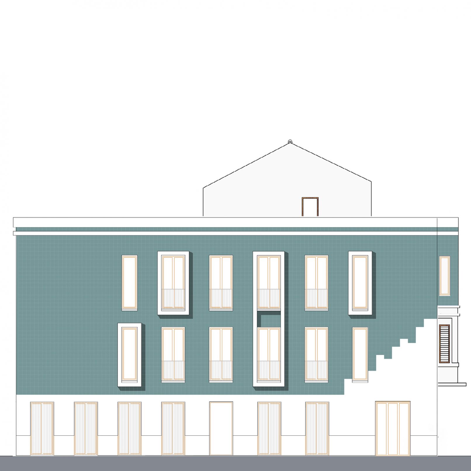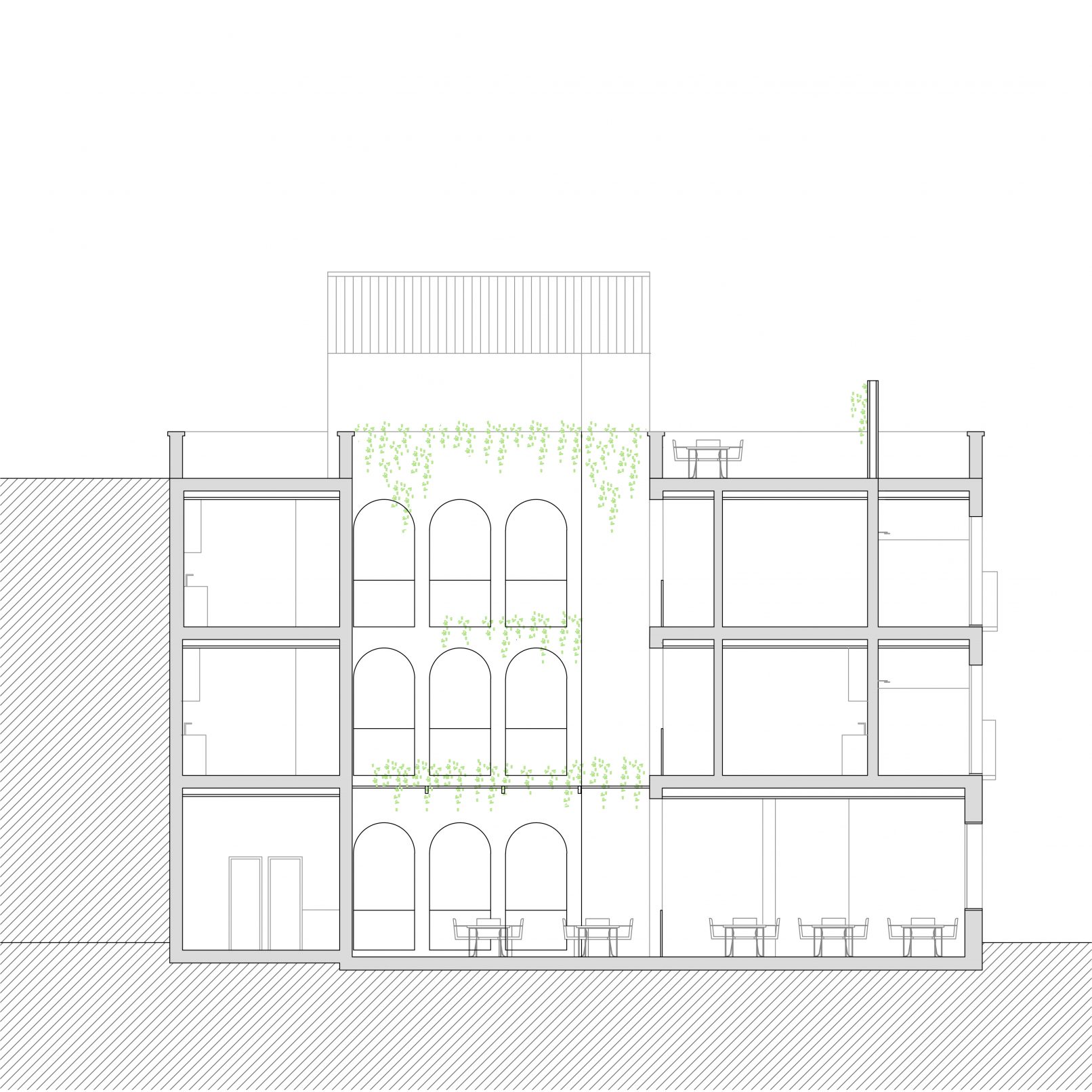 The existing building was the result of various extensions over the past century, which mixed classical styles with modernism or the 70s creative solutions. In this great chaos, the front façade, the staircase, and the old bakery on the ground floor stand out. And therefore these are the elements that have been preserved in the new extension, giving the building its character as a reminder of precious times.
