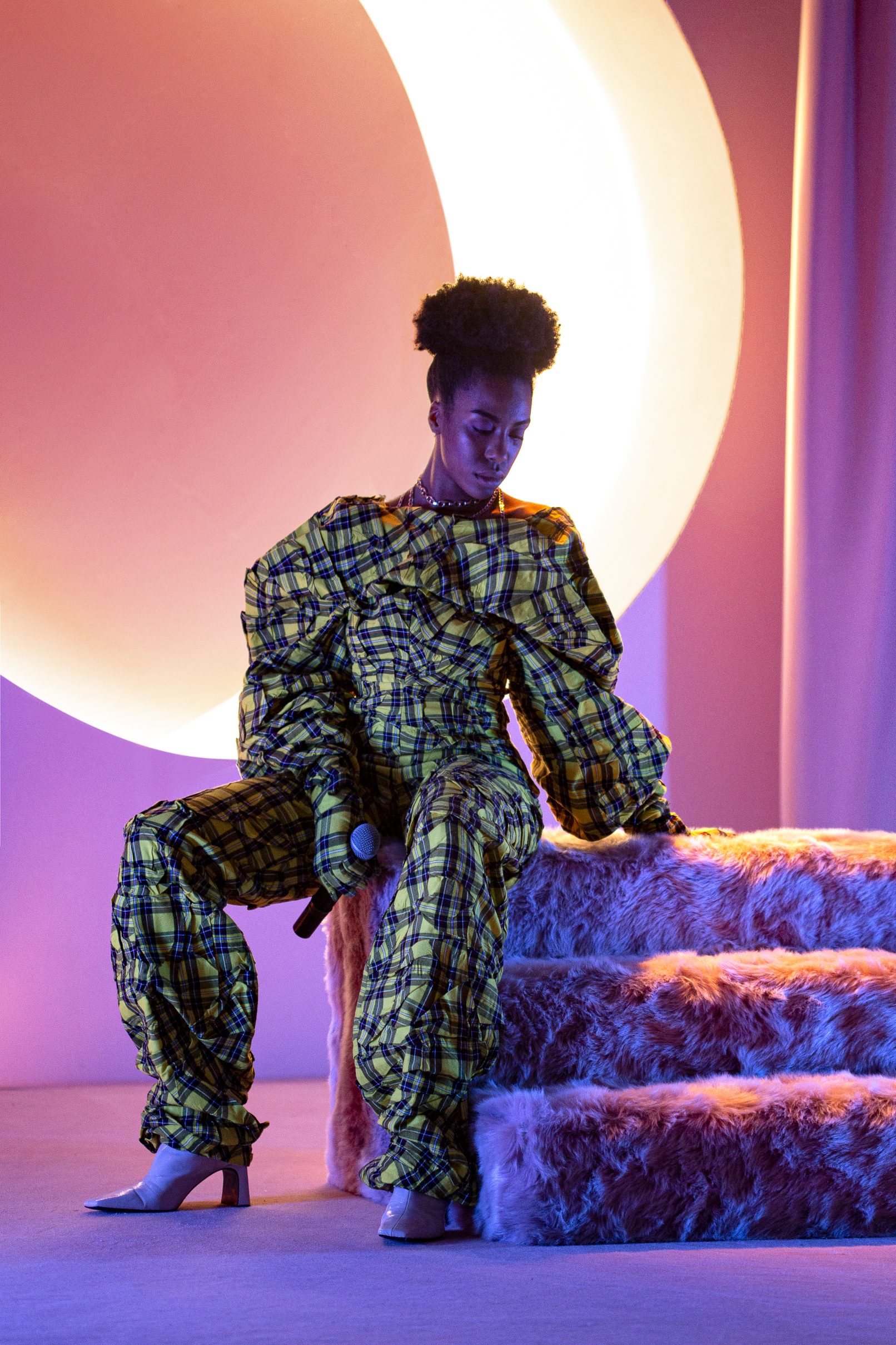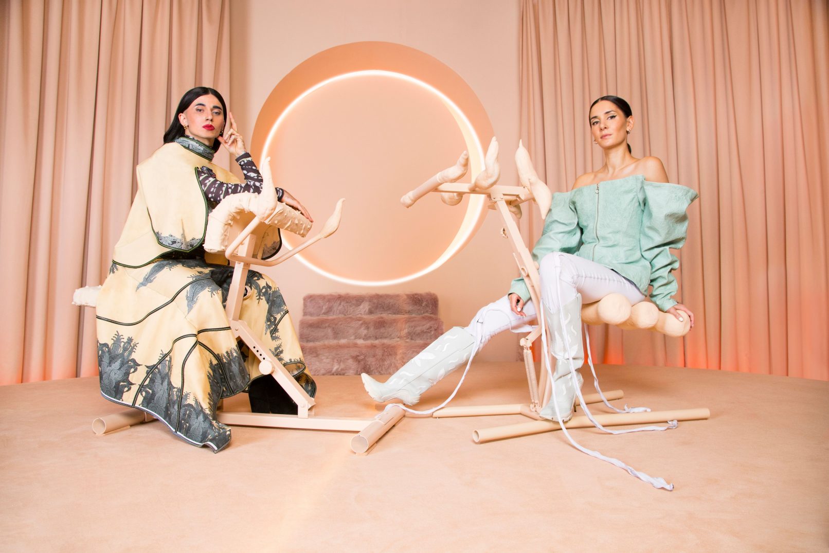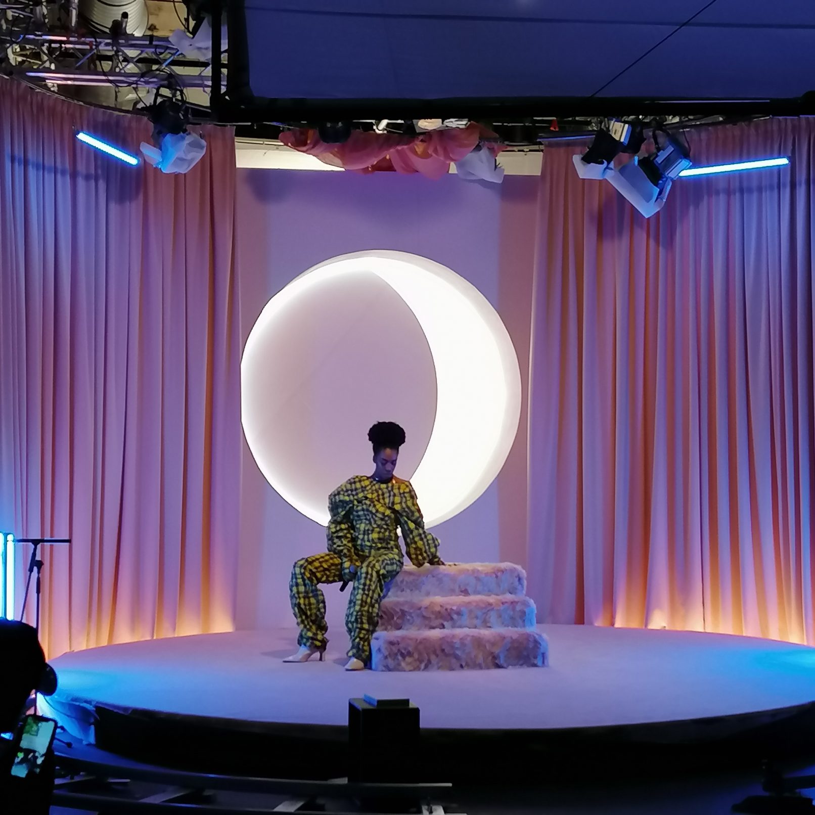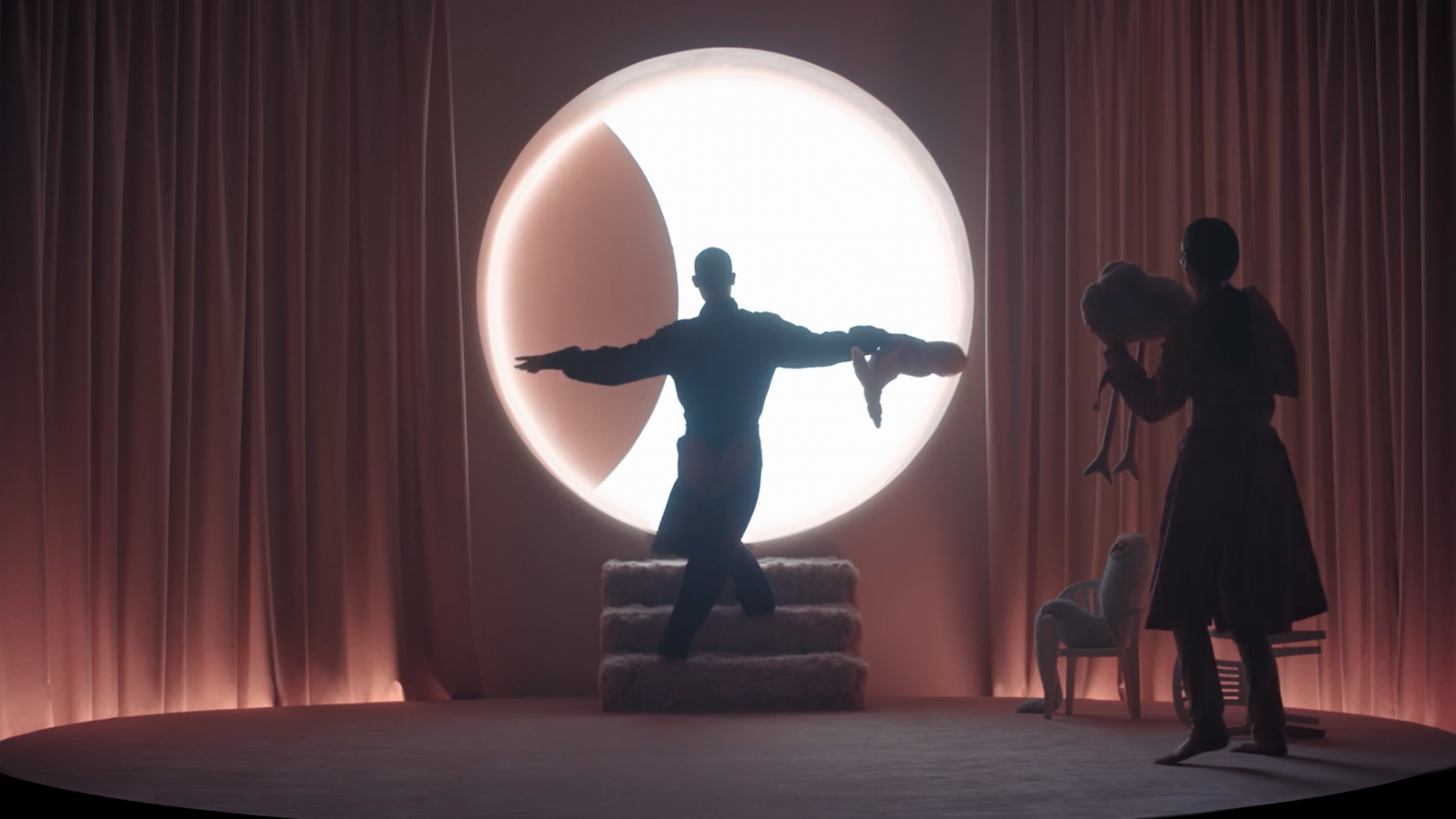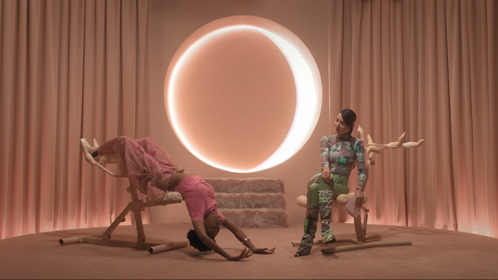 For the stage concept, the director was looking for a futuristic atmosphere, not set in any time or place, fluid, sophisticated but yet awkward. The idea was to review the 90s talk show aesthetic with a twist, incorporating all these elements to create something new and unusual. Since the concept was pretty wide, we decided to give different options, giving different interpretations to the deck from the production.