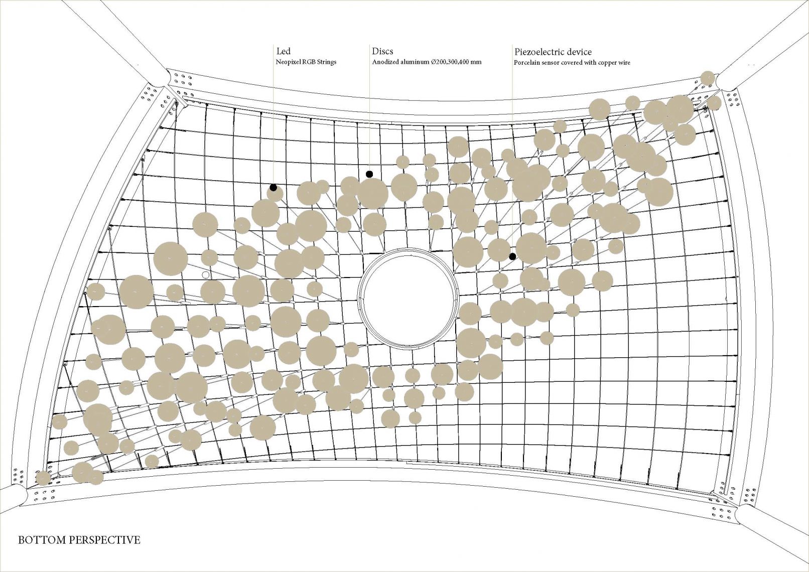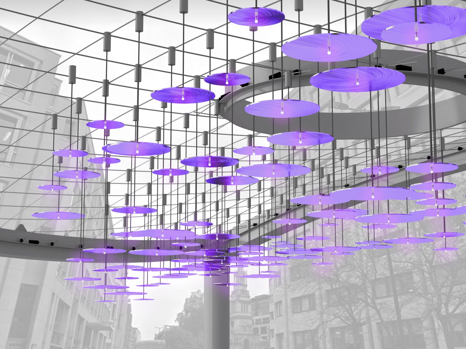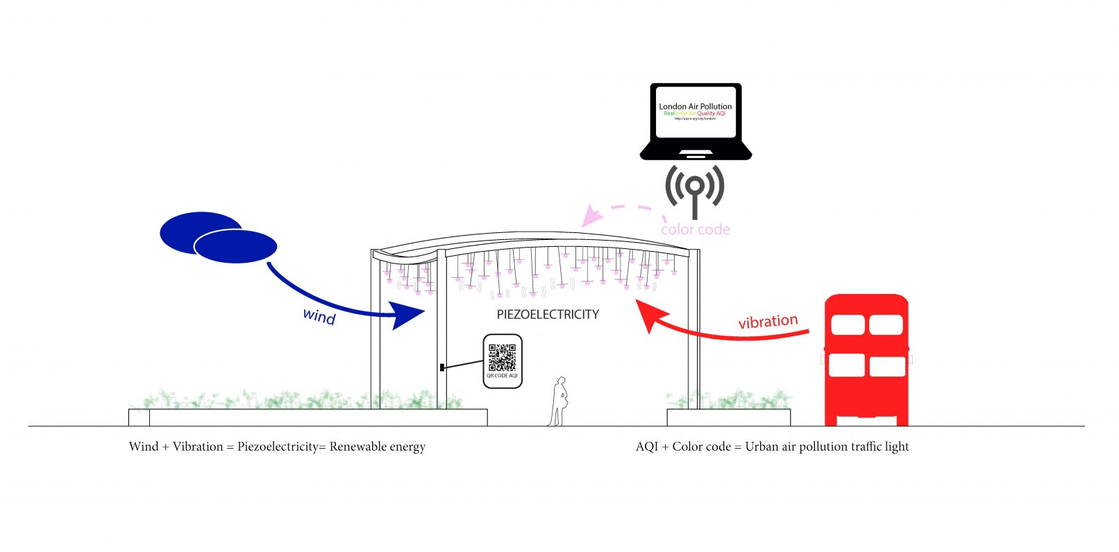 Based on the last advances in piezoelectric technology, Wind Wind proposes a self-sufficient light and sculpture installation, visible day and night, showing the levels of air pollution in the city in a visually attractive way. Composed by 100 piezoelectric devices connected to hanging lamps, Wind Wind uses the strength of wind flows and vibration produced by the traffic around the canopy to produce the energy needed to light the 152 LED bulbs displaying the information obtained via wifi from the real-time database http://aqicn.org/city/london/