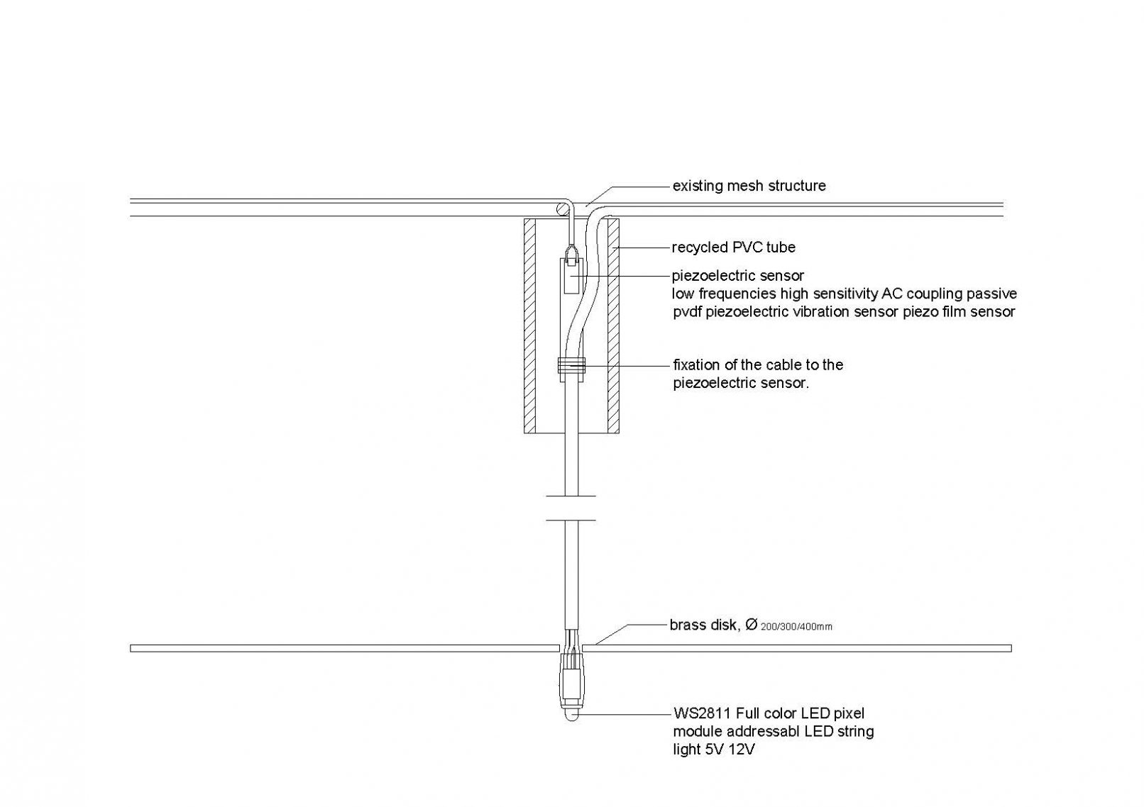 The system sponsored by Piezoskin S.R.L. is a simple network were the piezometers are connected to a motherboard that receives the data through a wifi device and transfers the information to the installation bulbs. This motherboard has 2 functions: first it transforms the data obtained via wifi from the database into a colour light scheme, and second, it regulates the electricity obtained by the piezometers and sends the signal to LED bulbs with the colour they have to display. The system is complemented by a battery capable of accumulating excess energy and releasing it the days of least production. This way the installation will be working 365 days a year.